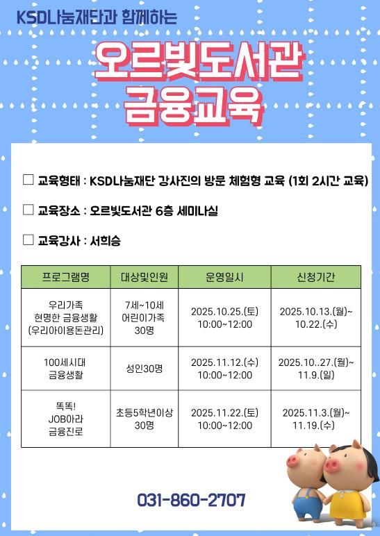 (포탈뉴스통신) 동두천시 도서문화사업소는 KSD나눔재단과 함께 10월 25일부터 11월 22일까지 오르빛도서관 6층 세미나실에서 세대별 맞춤형 금융교육 프로그램을 운영한다.
