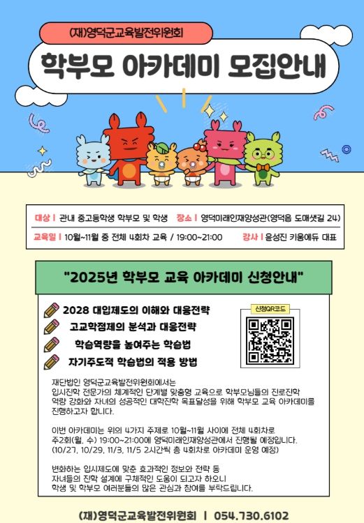 (포탈뉴스통신) (재)영덕군교육발전위원회는 급변하는 대학입시 환경에 효과적으로 대응하고, 학부모들의 교육 역량 강화를 위해 ‘학부모 교육 아카데미’를 운영한다.
