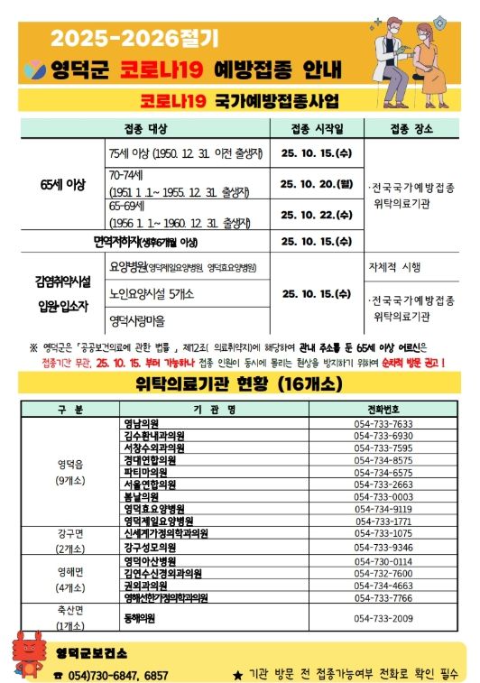 (포탈뉴스통신) 영덕군은 겨울철 감염병 유행에 대비해 오는 15일부터 내년 4월 30일까지 코로나19 예방접종을 시작한다.