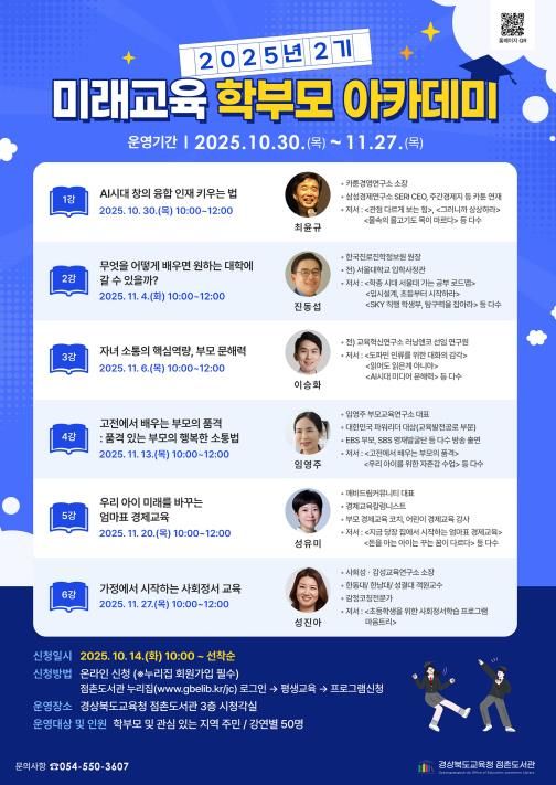 (포탈뉴스통신) 경상북도교육청 점촌도서관은 10월 30일부터 11월 27일까지 학부모 및 일반인을 대상으로 2025년 2기'미래교육 학부모 아카데미'를 운영한다.
