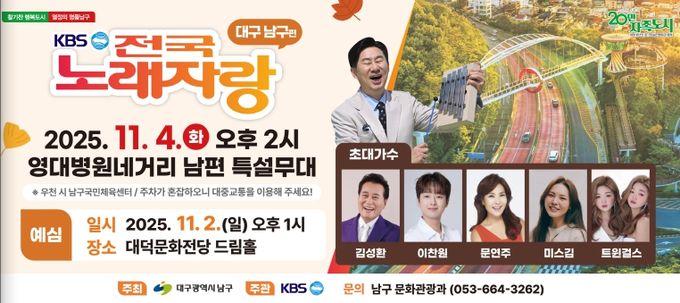 (포탈뉴스통신) 대구 남구는 국내 최장수 인기 프로그램인 KBS 전국 노래자랑 ‘대구 남구편’이 오는 11월 4일 오후 2시, 영대병원네거리 남편 특설무대에서 열린다고 밝혔다.