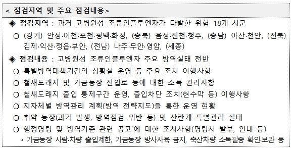 이번 점검은 지난 9월 12일 경기도 파주에서 과거보다 다소 이른 시기에 고병원성 조류인플루엔자가 가금농장에서 발생했고, 10월부터 겨울 철새가 본격 도래하면서 국내 추가 발생 가능성이 높아짐에 따라 선제적으로 농식품부, 행정안전부, 농림축산검역본부, 시도 관계관 합동으로 점검반을 구성하여 실시하는 것이다.