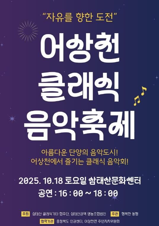 올해로 세 번째를 맞은 어상천 클래식음악축제는 귀농·귀촌인과 지역주민이 함께 만들어가는 생활문화 축제로, “모든 국민은 문화를 향유할 권리를 동등하게 누려야 한다”는 취지 아래 ‘인권연주회’를 표방한다.