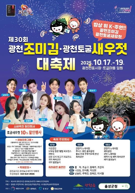 (포탈뉴스통신) 홍성군 광천읍은 오는 17일부터 19일까지 3일간 광천전통시장 및 토굴마을 일원에서 ‘제30회 광천조미김·광천토굴새우젓 대축제’의 성대한 막을 올릴 예정이라고 밝혔다.