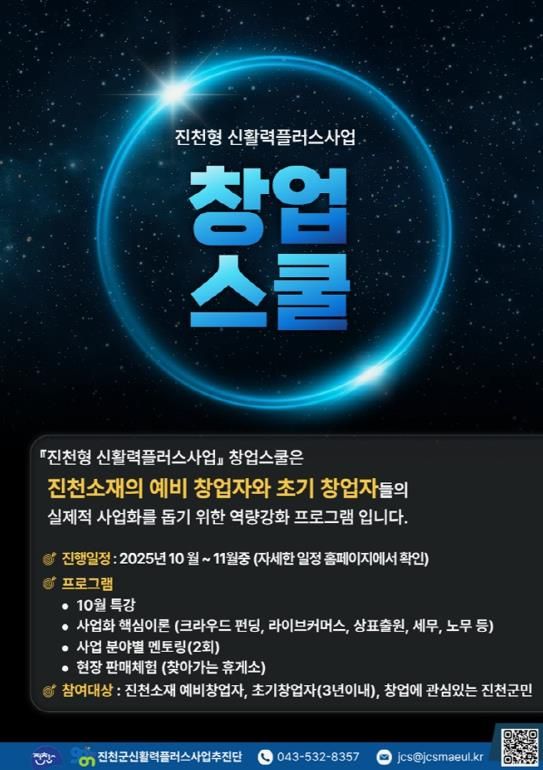 이번 과정은 인기 강사의 창업 특강을 시작으로, 관내 초기 창업자와 창업에 관심 있는 진천군민을 대상으로 이론 학습과 현장 경험을 단계별로 체험할 수 있는 교육을 진행한다.
