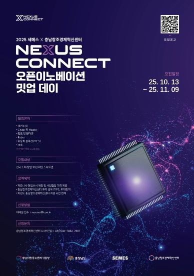 (포탈뉴스통신) (재)충남창조경제혁신센터와 세메스(주)는 반도체·디스플레이 장비 혁신을 이끌 유망 스타트업을 발굴·육성하기 위해 ‘2025 세메스 × 충남창조경제혁신센터 Nexus Connect 오픈이노베이션 밋업 데이’ 참여 기업을 11월 9일까지 모집한다.
