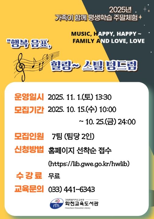 (포탈뉴스통신) 강원도교육청 화천교육도서관은 군민을 대상으로 2025년 11월 평생학습 주말체험 ‘늦가을, 가족 음악 특강: 행복 음표, 힐링 스틸 텅드럼’을 운영한다.