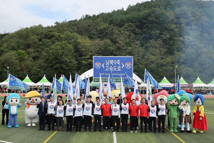 행사는 ‘남북9축, 함께 잇다’ 슬로건 아래 강원·경북 10개 시‧군 대표단이 운동장 양 끝에서 동시에 출발, 중앙에 위치한 제막무대에서 하나로 모여 ‘남북9축 고속도로’ 표지판을 공동 제막하는 순으로 진행됐다.