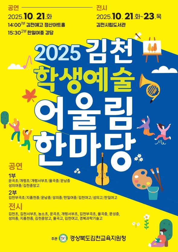 (포탈뉴스통신) 경상북도김천교육지원청은 오는 10월 21일 김천예술고등학교와 한일여자중학교에서 공연 행사를 열고, 김천시립도서관에서 전시 행사(21일-23일)를 통해 ‘2025 김천학생예술어울림한마당’을 개최한다.