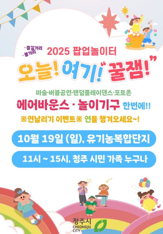 (포탈뉴스통신) 청주시는 오는 18일 개최 예정이었던 팝업 놀이터 ‘오늘! 여기! 꿀잼’을 비 예보로 인해 19일 오전 11시부터 오후 3시까지 유기농복합단지에서 운영한다고 밝혔다.