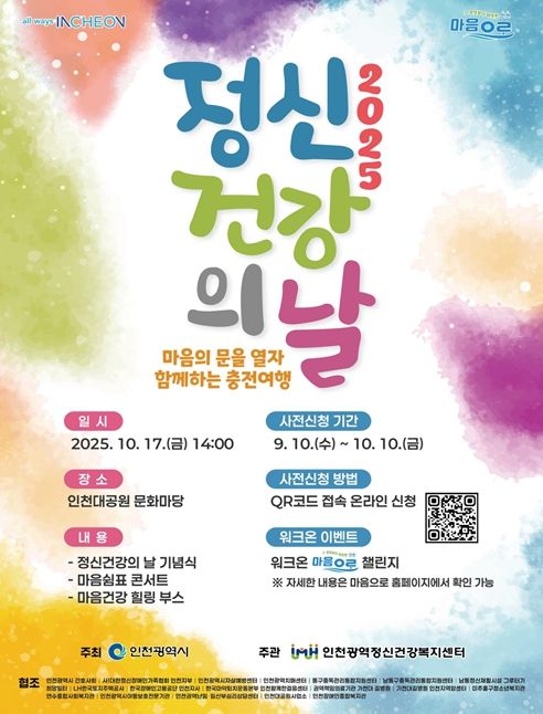 (포탈뉴스통신) 인천광역시는 10월 17일 인천대공원 문화마당에서 ‘마음의 문을 열자, 함께하는 충전 여행’이란 주제로‘2025년 정신건강의 날 기념행사’를 개최한다.