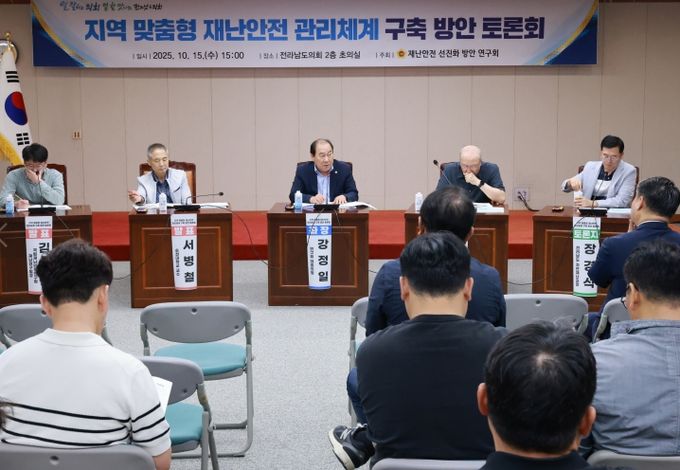 (포탈뉴스통신) 전라남도의회 의원 연구단체인'재난안전 선진화 방안 연구회'는 지난 10월 15일 전라남도의회 초의실에서 강정일 대표의원(광양2) 주재로 ‘지역 맞춤형 재난안전 관리체계 구축 방안’에 대한 토론회를 개최했다.