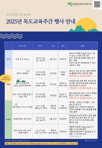 (포탈뉴스통신) 경상북도교육청 청도도서관은 오는 10월 17일부터 30일까지 지역 주민을 대상으로 '2025년 독도교육주간 행사'를 운영한다.