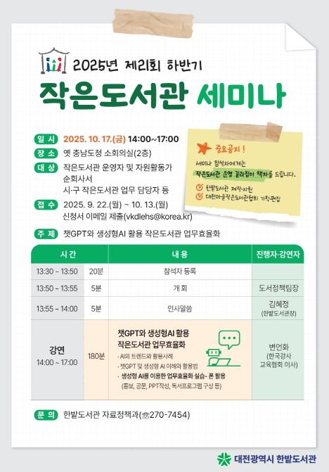 (포탈뉴스통신) 한밭도서관은 17일 금요일 오후 14시부터 구 충남도청사 소회의실(2층)에서 대전 지역 작은도서관 운영자와 자원활동가를 대상으로 세미나를 개최한다.