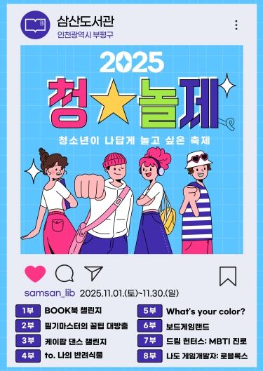 (포탈뉴스통신) 부평구 구립 삼산도서관은 11월 한 달간 청소년(중학교 1학년~고등학교 3학년) 대상 문화체험 프로그램 ‘청★놀제: 청소년이 나답게 놀고 싶은 축제’를 운영한다.