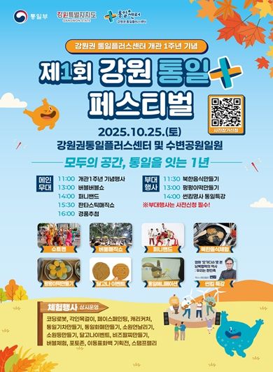 (포탈뉴스통신) 강원특별자치도는 오는 10월 25일 오전 10시 30분, 춘천 삼천동 강원권 통일플러스센터 및 수변공원 일원에서 센터 개관 1주년을 기념한 '통일플러스페스티벌'을 개최한다고 밝혔다.