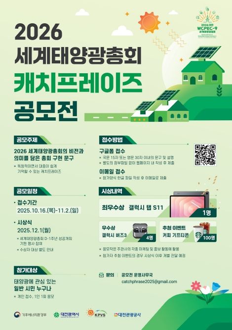 (포탈뉴스통신) 대전시는 2026년 11월 대전에서 개최되는 세계태양광총회(WEPEC-9)의 비전과 정체성을 창의적으로 담아낸 캐치프레이즈를 오는 11월 2일까지 공모한다.