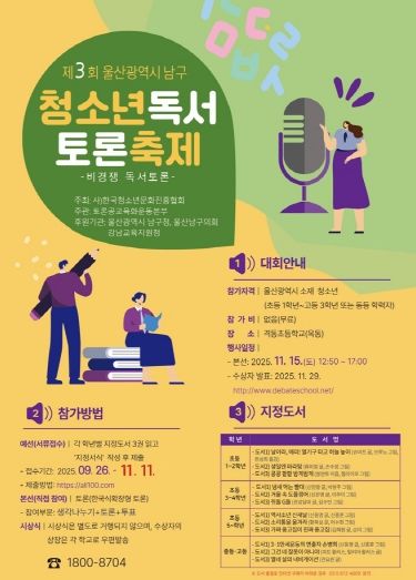 (포탈뉴스통신) 울산 남구는 청소년의 독서습관 형성과 건전한 토론문화 확산을 위해 오는 11월 15일 격동초등학교에서 개최하는‘2025년 제3회 울산광역시 남구 청소년 독서 토론축제’참가자를 모집한다고 밝혔다.