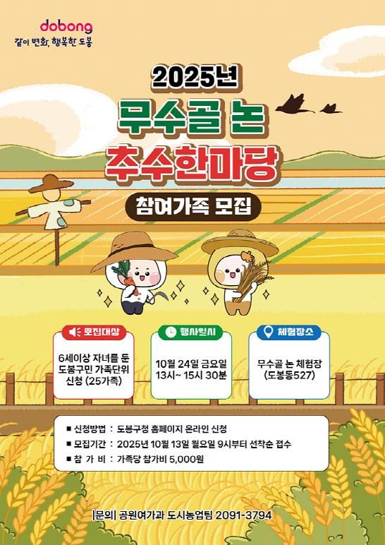 (포탈뉴스통신) 서울 도봉구가 오는 10월 24일 무수골 친환경 논 체험장(도봉동 527)에서 ‘무수골 논 추수한마당’ 행사를 개최한다.