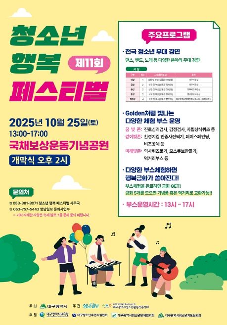 (포탈뉴스통신) 대구광역시는 10월 25일 오후 2시, 국채보상운동기념공원에서 ‘2025년 제11회 청소년 행복 페스티벌’을 개최한다.
