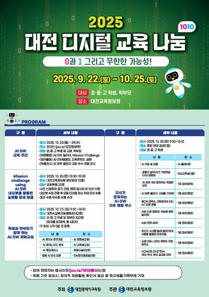 (포탈뉴스통신) 대전교육정보원은 ‘0과 1 그리고 무한한 가능성’을 주제로 ‘2025년 대전 디지털 교육 나눔1010’ 행사를 9월 22일부터 10월 28일까지 5주간 초·중·고 학생, 교원, 학부모를 대상으로 다채로운 온·오프라인 프로그램을 기획하여 성황리에 운영했다고 밝혔다.