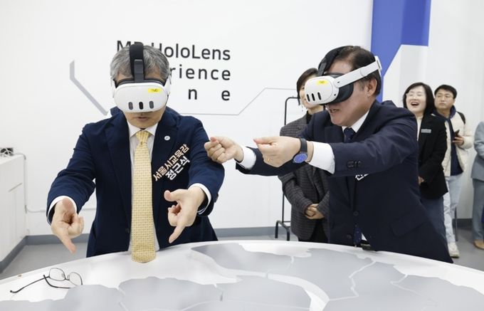 진 구청장은 정근식 서울시교육감과 함께 가상 공간에서 건물과 물건을 자유자재로 배치해 보는 ‘MR(혼합현실) 홀로렌즈’, 드론비행 등을 체험했다.