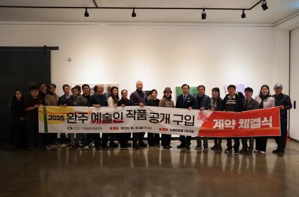 (포탈뉴스통신) (재)완주문화재단은 10월 31일 복합문화지구 누에아트홀에서 [2025 완주 예술인 작품 공개 구입] 최종 선정 작가들과 작품 구입 계약 체결식을 개최했다.