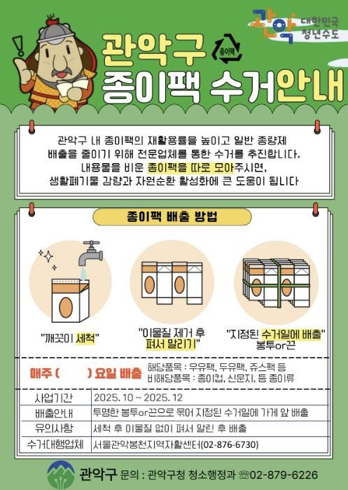 (포탈뉴스통신) 관악구가 오는 12월 말까지 ‘종이팩 중점 수거사업’을 집중적으로 추진하여, 종이팩의 재활용률을 높이고 일반 종량제 배출을 줄이는데 주력한다.