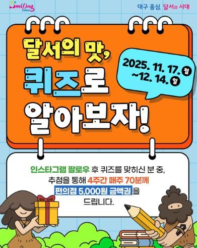 각 회차 종료 후에는 추첨을 통해 매주 70명씩 총 280명에게 편의점 모바일 상품권(5,000원권)을 증정하며, 당첨자 명단은 달서맛나 홈페이지를 통해 공개될 예정이다.