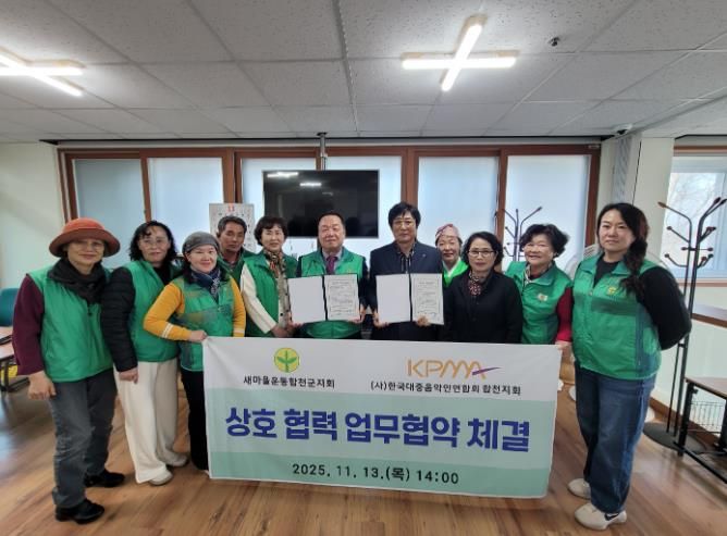 (포탈뉴스통신) 새마을운동합천군지회와 (사)한국대중음악인연합회 합천군지회는 11월 13일 오후 2시 새마을운동합천군지회 사무실에서 지회 회장단과 지도자, 한국대중음악인연합회 합천지회 회장단 20명이 참여한 가운데 ‘상호협력 업무 협약식’을 가졌다.