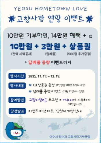 (포탈뉴스통신) 여수시는 연말정산 시즌을 맞아 고향사랑기부 참여자에게 더 많은 혜택을 제공하기 위해 ‘고향사랑기부제 연말 이벤트’를 진행한다.