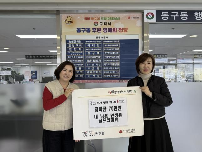(포탈뉴스통신) 구리시 동구동 행정복지센터는 지난 18일 동구동 행정복지센터 대회의실에서 '내 남은 인생은 골프와 함께' 모임으로부터 관내 취약계층 청소년을 위한 장학금 70만 원을 기탁받았다고 밝혔다.