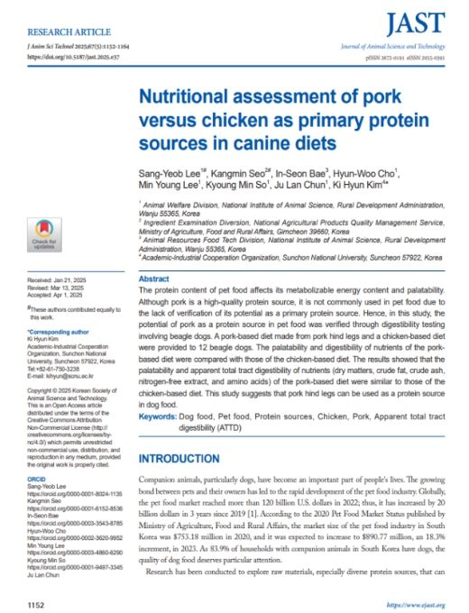 연구진은 비글견 12마리에게 닭고기 기반 사료와 돼지고기 뒷다리살을 단백질원으로 제조한 시험 사료를 각각 15일간 급여한 후, 소화율과 기호성을 비교 평가했다.