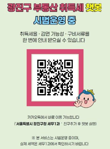 (포탈뉴스통신) 광진구가 부동산 정책 변화에 따른 취득세 감면 확대와 직접 신고 증가에 대응하기 위해 카카오톡 기반 ‘부동산 취득세 안내 채팅로봇’을 시범 운영한다.