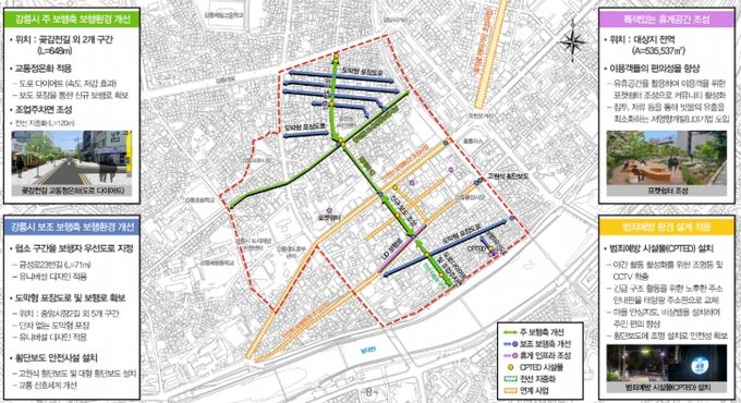 주요 사업은 ▲주 보행축 도로다이어트 및 보도 확보 ▲보행자 우선도로 도입 ▲고원식·대형 횡단보도 설치 ▲포켓쉼터·녹지 기반 휴게공간 조성 ▲범죄예방 시설물(CPTED) 기반 야간 안전환경 강화 등이다.