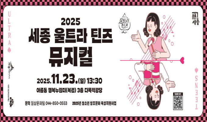 (포탈뉴스통신) 세종시문화관광재단은 11월 23일, 아름동 행복누림터 3층 다목적강당에서 청소년 무대예술 교육 프로그램의 성과를 선보이는 ‘2025 세종 울트라 틴즈 뮤지컬’ 공연을 개최한다. 이번 공연은 약 4개월간의 교육 과정을 통해 성장한 청소년들의 창작 역량을 발표하는 자리다.