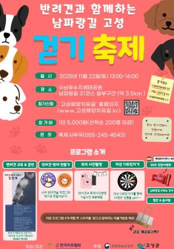 이상근 고성군수는 “이번 걷기축제는 반려동물과 함께하는 관광 콘텐츠를 통해 고성군의 아름다운 자연과 건강한 반려문화를 널리 알리는 계기가 될 것”이라며, “많은 분들이 가족 같은 반려견과 소중한 추억을 만들고, 고성의 매력을 만끽하길 바란다”고 밝혔다.