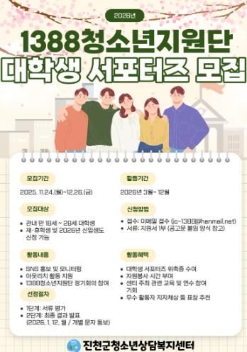 (포탈뉴스통신) 충북 진천군청소년상담복지센터는 이달 24일부터 대학생 대상 서포터즈 프로그램 ‘2026년 1388청소년지원단 대학생 서포터즈’ 참가자를 모집한다고 밝혔다.