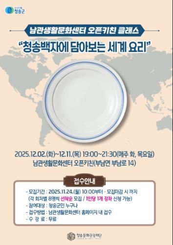 (포탈뉴스통신) (재)청송문화관광재단은 지역 대표 문화유산인 청송백자에 세계 각국의 음식을 직접 만들어 담아보는 체험형 요리 수업 ‘청송백자에 담아보는 세계 요리’를 오는 12월 2일부터 11일까지 매주 화·목 저녁 7시부터 9시 30분까지 남관생활문화센터 오픈키친에서 총 4회 운영한다고 밝혔다.
