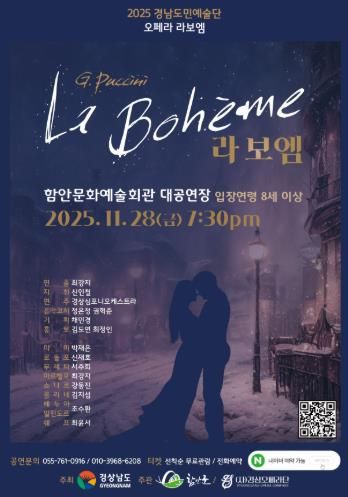 (포탈뉴스통신) 함안군은 푸치니의 대표작 오페라 〈라 보엠〉을 오는 2025년 11월 28일 오후 7시 30분, 함안문화예술회관 대공연장에서 전석 무료로 선보인다고 밝혔다.