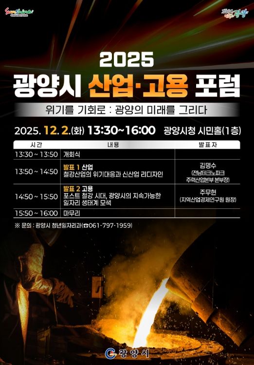 (포탈뉴스통신) 광양시는 오는 12월 2일 오후 1시 30분, 시청 시민홀에서 ‘2025 광양시 산업・고용 포럼’을 개최한다고 밝혔다.