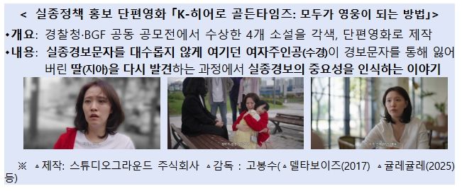 특히, 「K-히어로 골든타임즈: 모두가 영웅이 되는 방법」은 이날 처음 공개하는 단편영화로, 여자주인공(수경)이 실종경보문자를 통해 잃어버린 딸(지아)을 발견하면서 실종경보의 중요성을 깨닫는 이야기를 담았다.