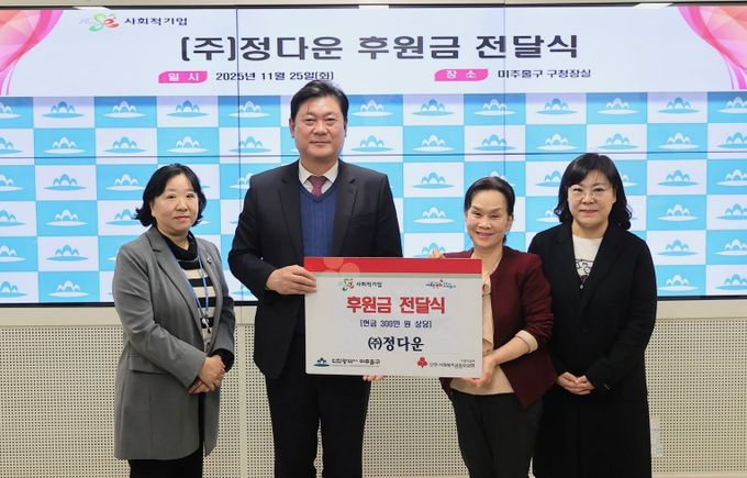 (포탈뉴스통신) 인천 미추홀구는 지난 25일 구청장실에서 사회적기업 ㈜정다운(대표 장옥순)으로부터 지역사회 나눔 실천을 위한 성금 300만 원을 전달받았다.