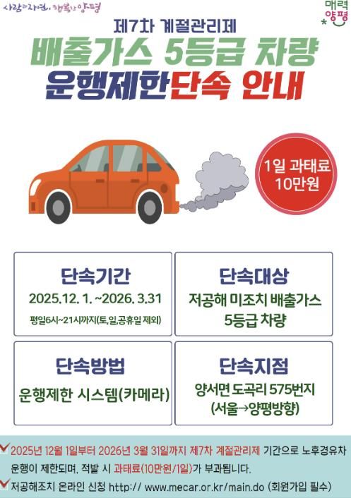 (포탈뉴스통신) 양평군(은 오는 12월 1일부터 2026년 3월 31일까지 제7차 미세먼지 계절 관리제 시행에 따라 배출가스 5등급 차량에 대한 운행 제한 단속을 시행한다고 밝혔다.