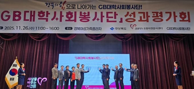 (포탈뉴스통신) 경상북도는 26일 경북여성가족플라자에서 ‘2025 GB(경북)대학사회봉사단 성과평가회’를 개최하고, 2025년 한 해 동안의 지역사회 곳곳에서 자원봉사로 활약한 GB대학사회봉사단의 성과를 공유하는 시간을 가졌다.