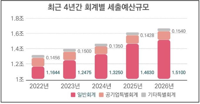 회계별 세출예산 규모를 살펴보면 일반회계는 1조 1,644억 원에서 1조 5,100억 원으로 3,456억 원(29.7%) 늘어났고, 특별회계는 1,456억 원에서 1,540억 원으로 84억 원(5.8%) 증가했다.