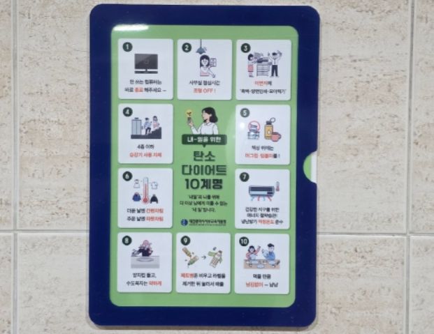 (포탈뉴스통신) 대전서부교육지원청은 공공기관의 적극적인 에너지 절약 문화를 정착시키고, 민원인과 직원들이 함께 보고 참여할 수 있도록 지원청 내 화장실에 ‘내-일을 위한 탄소 다이어트 10계명’ 홍보물을 제작하여 부착했다고 밝혔다.