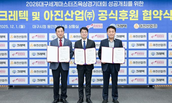 (포탈뉴스통신) 2026대구세계마스터즈육상경기대회 조직위원회는 12월 1일 오전 10시 30분, 대구광역시청 동인청사에서 지역 우량기업인 크레텍 및 아진산업㈜과 공식 후원 협약을 체결했다.