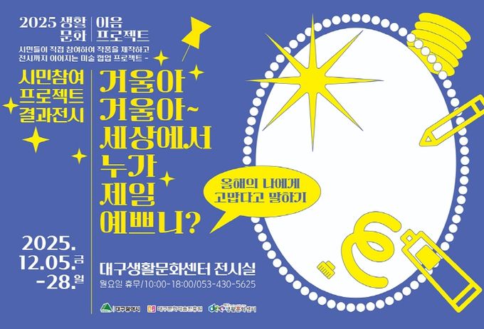 (포탈뉴스통신) 대구문화예술진흥원 대구생활문화센터는 ‘2025 생활문화 이음 프로젝트’ 결과 전시 ‘거울아, 거울아~ 세상에서 누가 제일 예쁘니?’를 12월 5일부터 28일까지 대구생활문화센터 1층 전시실에서 개최한다.