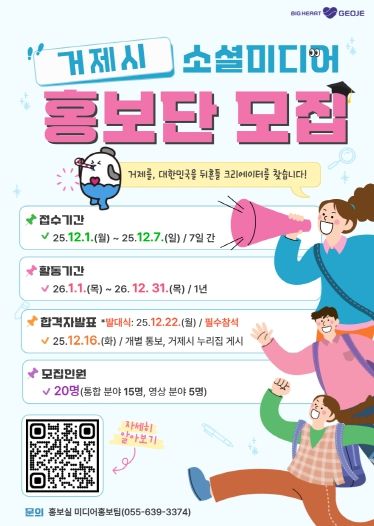 (포탈뉴스통신) 거제시는 시정과 지역의 매력을 널리 알릴'제7기 거제시 소셜미디어 홍보단'을 12월 1일부터 12월 7일까지 공개 모집한다고 밝혔다.
